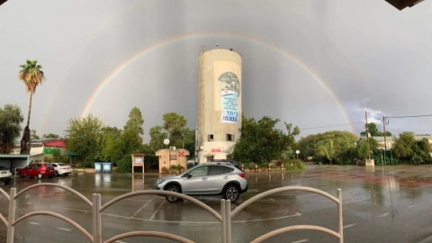 קשת של תקווה מעל מגדל המים בקיבוץ גבעת השלושה אתמול