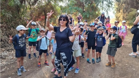 ילדות וילדי כיתות א׳ צועדים לאורך הירקון ביום ההליכה הבין לאומי