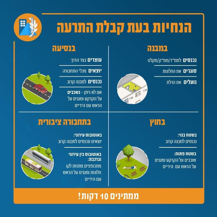 פיקוד העורף מנחה את תושבי הדרום והמרכז לשהות בקרבת מרחבים מוגנים ובקבלת התרעה להיכנס למרחב מוגן ולשהות בו 10 דקות. בחדר המוגן יש לשבת על הרצפה, מתחת לקו החלון, להיצמד לקיר פנימי ולא לשבת מול חלון. הנחיות פיקוד העורף הוכחו כמצילות חיים.