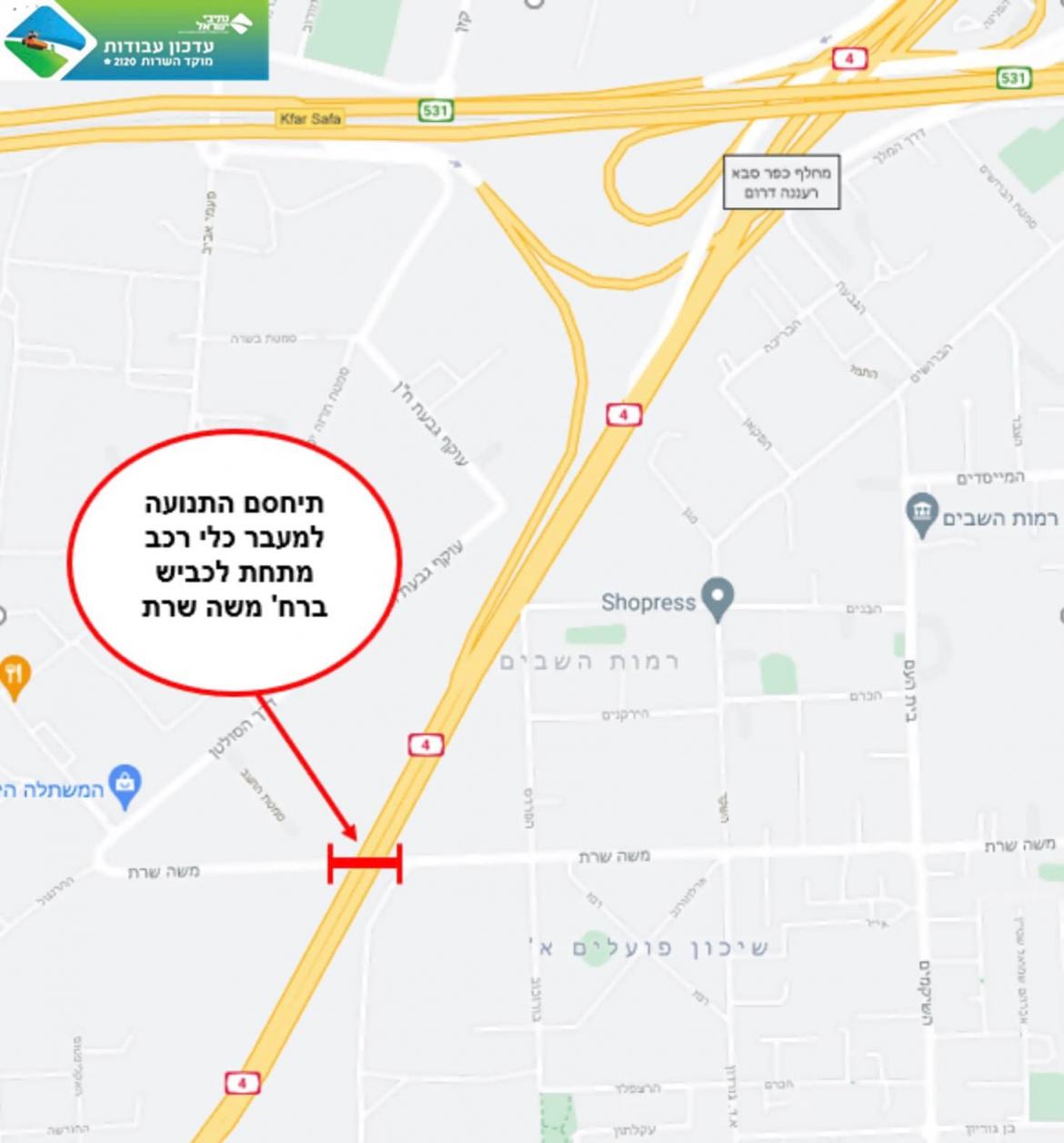 החל מהיום (ראשון) 17.10.21 ועד 19.10.21 (כולל) ייחסם לתנועת כלי רכב והולכי רגל המעבר בין רמות השבים לגבעת ח"ן (מתחת לכביש 4).