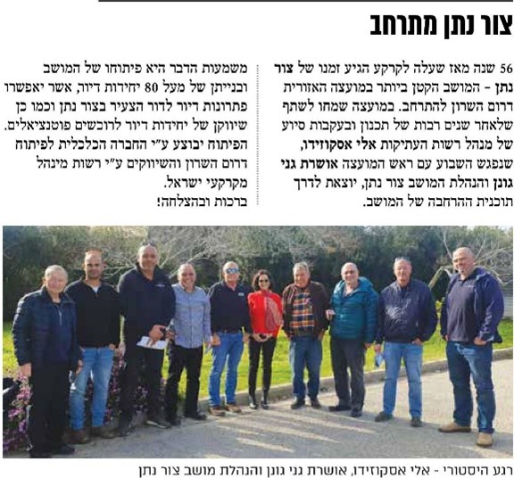 לאחר שנים רבות של תכנון ובעקבות סיוע של מנהל רשות העתיקות אלי אסקוזידו, שנפגש השבוע עם ראש המועצה אושרת גני גונן והנהלת צור נתן, יוצאת לדרך תוכנית ההרחבה של המושב.
